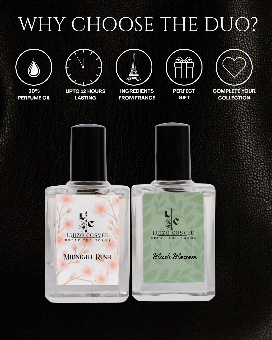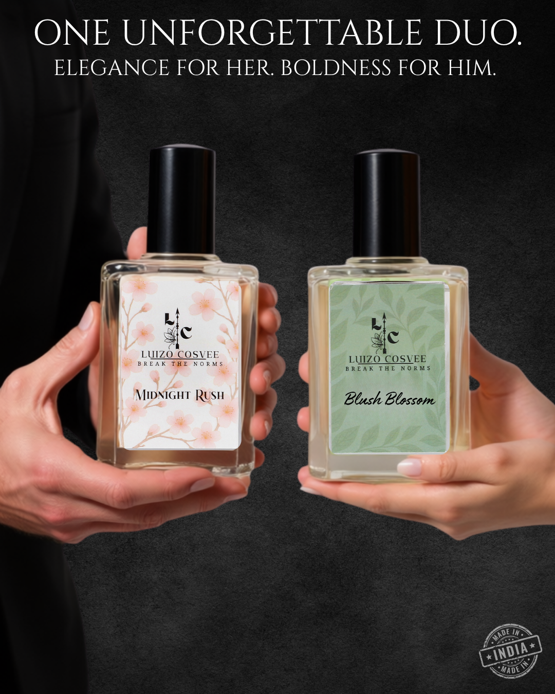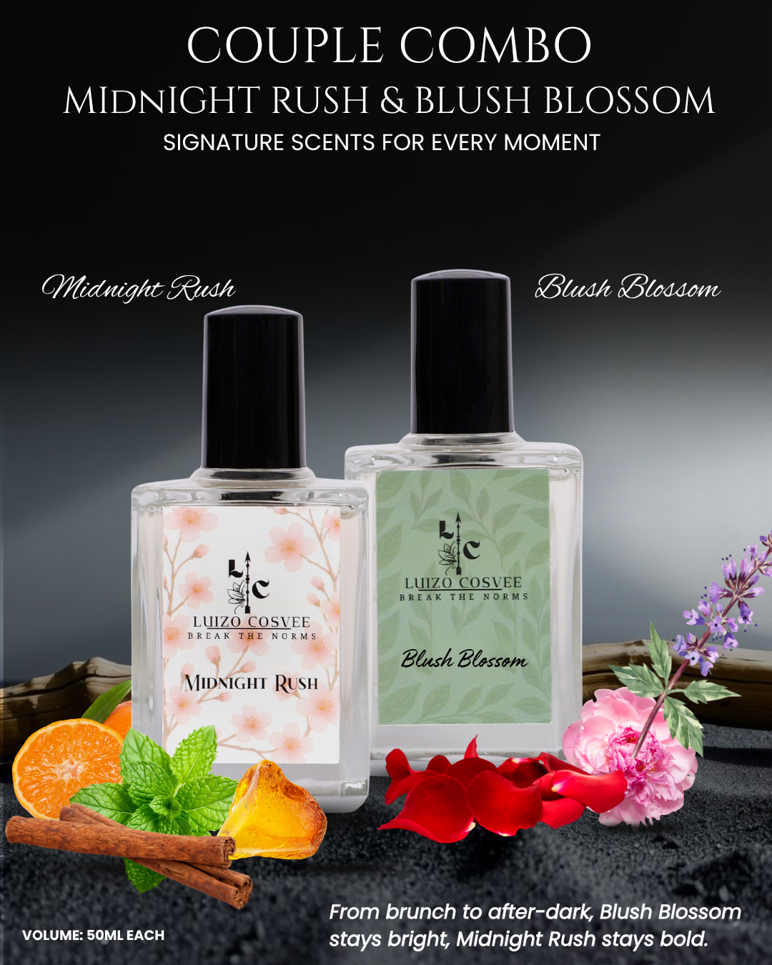 Midnight Rush opens with grapefruit and cinnamon — sharp, electric, dominant. Ambur Rush answers with caramelized mandarin and smoked vanilla — sweet, glowing, irresistible. Together, they create an aura that’s both commanding and comforting — perfect for CEOs, performers, or anyone who leads with presence.